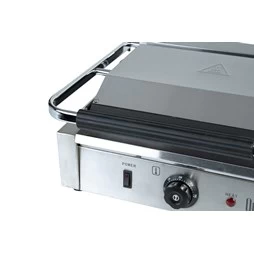 This contact panini grill has a top and bottom ribbed cast iron plate press. This feature gives that signature grill experience for chicken, paninis, burgers, and more. It also allows for even cooking on both sides with ease. Plus, this product offers a reliable performance that is especially ideal for cafes and outdoor catering.