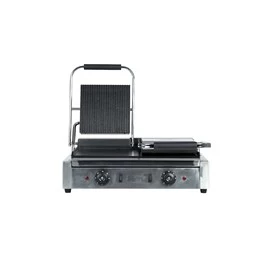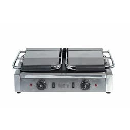 The Quattro Heavy Duty Twin Contact Panini Grill has a Ribbed Top and Flat Bottom Plates. This makes it the perfect versatile tool for getting your grill on and serving quality food.