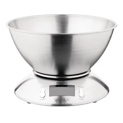 Ultra stylish and highly functional, introducing the easy to clean stainless steel bowl digital kitchen scale from Vogue. These 5kg bowl scales are a fantastic addition to any kitchen big or small. The stylish stainless steel is easy to wipe clean and is designed not only to look incredible but to be hygienic to use. Capable of weighing food up to 5kg/11lbs these versatile food scales are must have in any kitchen.