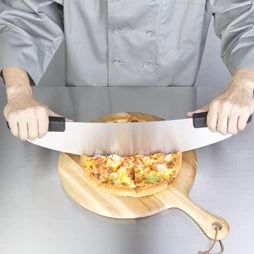 Effortlessly slice pizza with this high quality Vogue pizza cutter. Innovatively designed, the stainless steel, single piece rigid blade slices through pizza in one single motion, helping you cut cleanly and quickly for a more effective and efficient preparation. The one-piece design also means the cutter is exceptionally easy to clean and maintain, requiring minimal effort to keep hygienic. Featuring two ergonomic handles, one on either end of the blade, this kitchen essential offers a more comfortable and secure grip to give you the best possible results.
